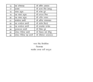 घोषित पदाधिकारी में उपाध्यक्ष – दिनेश साहू, मधुसूदन शुक्ला, चंद्रिका यादव, विकास पाण्डेय, मधु चौदाहा , इंदर भगत, महामंत्री – विनोद हर्ष , अरुणा सिंह, मंत्री – रजनीश पाण्डेय, वैभव सिंह देव, रज्जु राम , नीरू मिस्त्री, पूनम टेकाम, सुनीता राजवाड़े, कोषाध्यक्ष – निश्चल प्रताप सिंह, सह कोषाध्यक्ष – सचिन अग्रवाल, प्रवक्ता – अजय सिंह (बबलू), संवाद प्रमुख – रूपेश दुबे, सह संवाद प्रमुख – धनंजय मिश्रा, जतिन परमार, कार्यालय प्रभारी – अनिल जायसवाल, सह कार्यालय प्रभारी – संतोष बिहाड़े , रामप्रवेश पाण्डेय, पुस्तकालय प्रभारी – विवेक दुबे, सोशल मीडिया प्रभारी – विकास वर्मा (रिंकु), सोशल मीडिया सह प्रभारी – रविशंकर जायसवाल हैं।