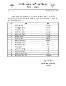 भारतीय जनता पार्टी छत्तीसगढ़ के माननीय प्रदेश अध्यक्ष किरण सिंह देव एवं प्रदेश संगठन महामंत्री पवन साय की सहमति तथा भाजपा सरगुजा जिलाध्यक्ष भारत सिंह सिसोदिया की अनुशंसा से सरगुजा जिला भाजपा पदाधिकारियों की घोषणा की गई है।