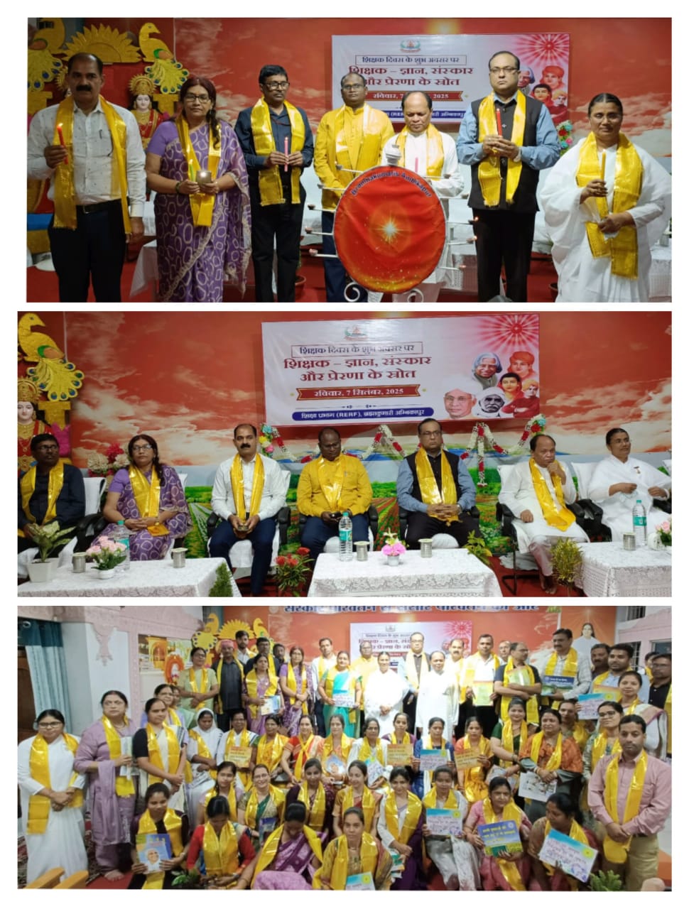 केंद्रीय विद्यालय अंबिकापुर के प्राचार्य श्री राजेश प्रसाद ने कहा कि गुरु शब्द में गु का अर्थ अंधकार एवं रु का अर्थ प्रकाश होता है। गुरु अर्थात अंधकार से प्रकाश की ओर ले जाने वाला, इसके लिए इस बात की आवश्यकता है की शिक्षा और आध्यात्म एक साथ आए। आज बच्चों को सुसंस्कारित बनाने की महती जिम्मेदारी हमारे शिक्षकों पर हैं। शिक्षक केवल एक शब्द नहीं बल्कि जिस तरह माली पौधों को काट छांट कर एक आकार देता है, कुम्हार मिट्टी को थपथपा कर एक सुंदर बर्तन बनाता है, शिल्पकार एक पत्थर से पूजनीय मूर्ति का निर्माण करता है अर्थात पत्थर में देवत्व की स्थापना करता है ठीक इसी प्रकार हमारे शिक्षक भी एक चरित्र शिल्पी हैं जो मानव में मनुष्यत्व का निर्माण करता है। कार्यक्रम में शासकीय कंप्यूटर साइंस इंजीनियरिंग कॉलेज अंबिकापुर के एच ओ डी डॉ मोहन राव मामडीकर, आईटीआई अंबिकापुर की प्रिंसिपल श्रीमती पूर्णिमा पटेल एवं समग्र शिक्षा के ए पी सी संजय सिंह ने भी शिक्षक दिवस की शुभकामनाएं व्यक्त करते हुए अपने विचार रखें। कार्यक्रम में 150 से भी अधिक शिक्षक उपस्थित रहे जिनका तिलक एवं सम्मानिय पट्टिका से स्वागत किया गया तथा पौधा एवं ईश्वरीय सौगात देकर सम्मानित किया गया। समाज सेवक अनिल मिश्रा के पिताजी स्वर्गीय श्री श्याम सुंदर मिश्रा जी की स्मृति में उनकी ओर से सभी शिक्षकों को सम्मान स्वरूप डायरी एवं पेन भेंट की गई! गुरुओं के सम्मान में रेखा बहन ने गीत गाया एवं अदिति शगुन मान्या तथा उनके साथियों ने सुंदर नृत्य की प्रस्तुति दी। मंच का संचालन ब्रह्माकुमारी प्रतिमा बहन ने किया। कार्यक्रम में उप यातायात प्रभारी अभय तिवारी, समाजसेवक मंगल पांडे, नवीन गोयल, डॉ संजय गोयल एवं बड़ी संख्या में नगरवासी उपस्थित रहे।