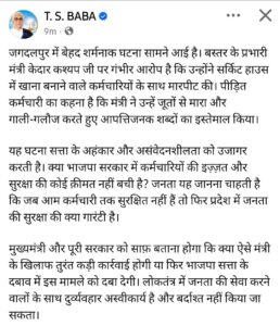 अंबिकापुर/ शनिवार शाम की इस घटना में मंत्री के द्वारा सर्किट हाउस के कर्मचारी पर यह आरोप लगाते हुए कि उसने कमरे नहीं खोले उसके साथ मारपीट की और माँ-बहन की गलियों के साथ जातिसूचक गालियां दी गई। पुलिस को दिये अपने आवेदन में इस कर्मचारी ने यह जिक्र किया है कि कमरे खुले हुए थे और वो नाश्ता बनाने गया हुआ था। इसके बावजूद मंत्री के द्वारा उंसे थप्पड़ों के साथ ही जूतों से भी मारा गया। इस घटना की लिखित सूचना पीड़ित कर्मचारी ने थाना जगदलपुर को दिया है। एक लकवाग्रस्त शासकीय कर्मचारी के साथ भाजपा के वरिष्ठ मंत्री के इस आपत्तिजनक और आपराधिक व्यवहार की जानकारी होने पर प्रदेश कांग्रेस कमेटी ने पूरे छत्तीसगढ़ में पुतला दहन का निर्णय लिया। इस दौरान जिला कांग्रेस कमेटी अध्यक्ष श्री बालकृष्ण पाठक ने कहा कि एक ऐसा व्यक्ति जो एक कर्मचारी की भावना को नहीं समझ पा रहा है, उंसे प्रताड़ित कर रहा है, उसे जातिसूचक गाली दे रहा है को प्रदेश सरकार में मंत्रिपरिषद में बने रहने का कोई अधिकार नहीं है। कांग्रेस माननीय मुख्यमंत्री जी से इनकी तत्काल बर्खास्तगी की मांग करती है। इस दौरान 20 सूत्रीय कार्यक्रम के पूर्व उपाध्यक्ष अजय अग्रवाल, निगम में नेता प्रतिपक्ष शफी अहमद, पीसीसी महामंत्री द्वितेन्द्र मिश्रा, ब्लॉक कांग्रेस अम्बिकापुर अध्यक्ष हेमंत सिन्हा, रामविनय सिंह, दुर्गेश गुप्ता, इरफान सिद्धकी, इंद्रजीत सिंह धंजल, श्री विनीत विशाल जायसवाल, श्रीमती सीमा सोनी, संजीव मंदिलवार, रसीद अहमद, गीता प्रजापति, अनूप मेहता, अशफाक अली, जमील खान, गुरुप्रीत सिद्धू, लोकेश पासवान, शंकर प्रजापति, चंद्रप्रकाश सिंह, नीतीश चौरसिया, रजनीश सिंह, निकी खान, सोहन जायसवाल, अमित तिवारी राजा, आशीष जायसवाल, आशीष शील, प्रीति सिंह, विष्णु सिंहदेव, काजू खान, प्रभात रंजन सिन्हा, जीवन यादव, विवेक सिंह, शिवप्रसाद अग्रहरि, उत्तम राजवाड़े, अविनाश कुमार, दिलीप धर, संजय सिंह, अमित सिंह, अमित वर्मा, रोशन कन्नौजिया, विकास शर्मा, तरणराज सिंह, परवेज आलम गाँधी, सुरेंद्र गुप्ता, संजर नवाज, अंकित जायसवाल, ऋषभ जायसवाल, जमशेर आलम, राहुल पटेल, नितिन कुशवाहा, शिवम राय, रेहान अली, आसिफ अशरफ, भानु प्रताप, चंचला शांडिल्य, श्रीमती शमीम, रश्मि सोनी, अनुराधा सिंह, आरती महंत, सपना सिन्हा, शकीला सिद्धकी आदि मौजूद थे।