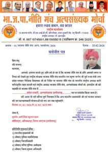 आपको अवगत कराते हुए अति हर्ष हो रहा है कि भाजपा नीति मंच के प्रति आपकी लगन व निष्ठा को देखते हुए राष्ट्रीय संरक्षक भाजपा नीति मंच माननीय राम कृष्ण भार्गव जी पूर्व राज्य मंत्री उत्तर प्रदेश सरकार मिश्रिख विधायक के निर्देश पर भाजपा नीति मंच के माननीय राष्ट्रीय अध्यक्ष कारी फतेउद्दीन खान कादरी एवं राष्ट्रीय अध्यक्ष भाजपा नीति मंच, अल्पसंख्यक मोर्चा मो. इसराईल जी की सहमति से भाजपा नीति मंच में ..प्रदेश प्रभारी, अल्पसंख्यक छत्तीसगढ़… पद पर मनोनीत किया जाता है।