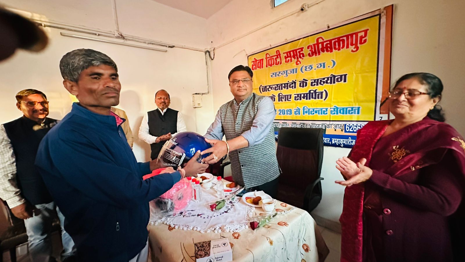 सेवा किटी समूह के द्वारा नवा बिहान नशामुक्ति जागरूकता अभियान एवं परामर्श केंद्र सरगुजा के कार्यालय में आयोजित हेलमेट बैंक के शुभारंभ कार्यक्रम के अवसर पर मुख्य अतिथि वरिष्ठ पुलिस अधीक्षक राजेश अग्रवाल, विशिष्ट अतिथि अतिरिक्त पुलिस अधीक्षक अमोलक सिंह ढिल्लो एवं विशिष्ट अतिथि उमेश कुमार गुप्ता आई पी एस रहे। सर्वप्रथम सेवा किटी समूह के सदस्यों के द्वारा अतिथियों क स्वागत पुष्प गुच्छ भेंट कर किया गया। सेवा किटी समूह की संस्थापिका सुश्री वन्दना दत्ता ने कहा कि हेलमेट के उपयोग के बिना दुपहिया वाहन चलाने से हो रही सड़क दुर्घटनाओं से संवेदित होकर हम सब मिलकर यातायात में दुर्घटना को कम करने एवं वाहन चालकों की सुरक्षा हेतु हेलमेट बैंक के लिए हेलमेट सुपुर्द करने के लिए कार्यक्रम आयोजित किया गया।इस हेलमेट बैंक की स्थापना हेतु स्वैच्छिक रूप से श्रीमती नीलम सिंह सेवा किटी सदस्य ने 10 हेलमेट, समाजसेवी अनिल कुमार मिश्रा ने 5 हेलमेट तथा नगर पालिका निगम अम्बिकापुर के सभापति हरमिंदर सिंह टिन्नी ने 51 हेलमेट देने को कहा है।आज सेवा किटी समूह के द्वारा प्रदत्त 11 हेलमेट से हेलमेट बैंक का शुभारंभ अतिथियों के द्वारा किया जायेगा । मुख्य अतिथि वरिष्ठ पुलिस अधीक्षक सरगुजा राजेश अग्रवाल ने अपने उद्बोधन में कहा कि सेवा किटी समूह की सोच एवं यातायात व्यवस्था के संबंध जो संवेदनशीलता है वह प्रशंसनीय है। इससे समुदाय के अन्य लोग भी प्रेरित होंगे। इस अभिनव पहल के लिए उपस्थित सभी लोगों को साधुवाद देता हूं। विशिष्ट अतिथि अतिरिक्त पुलिस अधीक्षक अमोलक सिंह ढिल्लो ने कहा कि स्वैच्छिक संगठनो एवं सरगुजा पुलिस के द्वारा संचालित नवा बिहान नशामुक्ति जागरूकता अभियान के द्वारा हेलमेट बैंक का संचालन उत्कृष्टता के साथ करेगा ।