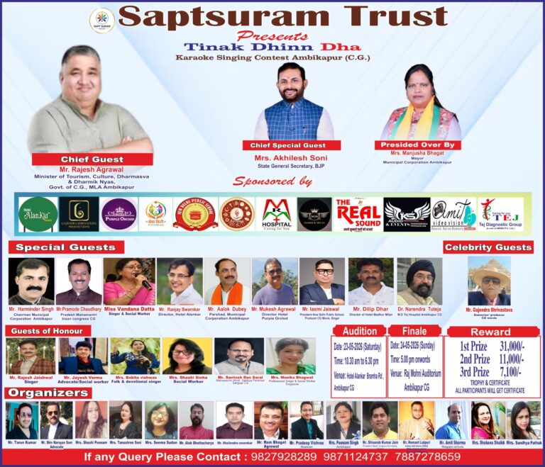 अम्विकापुर। सुरीली आवाज़ को मंच देने के उद्देश्य से सप्त सुरम ट्रस्ट द्वारा अम्विकापुर में ‘तिनक धिन धा कराओके सिंगिंग कॉन्टेस्ट’ का आयोजन किया जा रहा है। प्रतियोगिता का ऑडिशन 23 मई प्रातः 10.30 बजे से शाम 6.30 बजे तक होटल अलंकार, व्रह्म रोड अम्विकापुर मे आयोजित होगा।