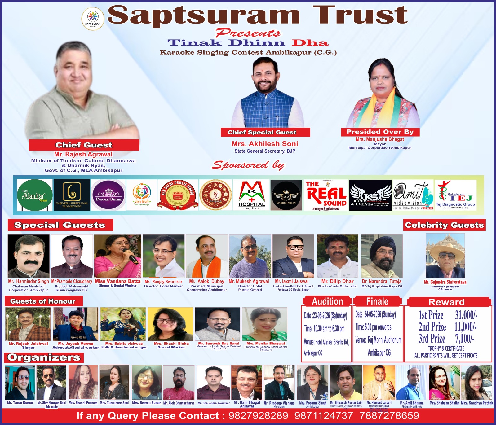 आयोजकगण— तरुण कुमार, एडवोकेट शिवनारायण सोनी, शशि पूनम, तनुश्री सोनी ,भट्टाचार्य, सीमा सूदन,डाॅक्टर आलोक भट्टाचार्य, शैलेन्द्र स्वर्णकार, राम भगत अग्रवाल, प्रदीप विश्वास, पूनम सिंह, हेमन्त लालपुरी ,शवाना शेख, संध्या पाठक .