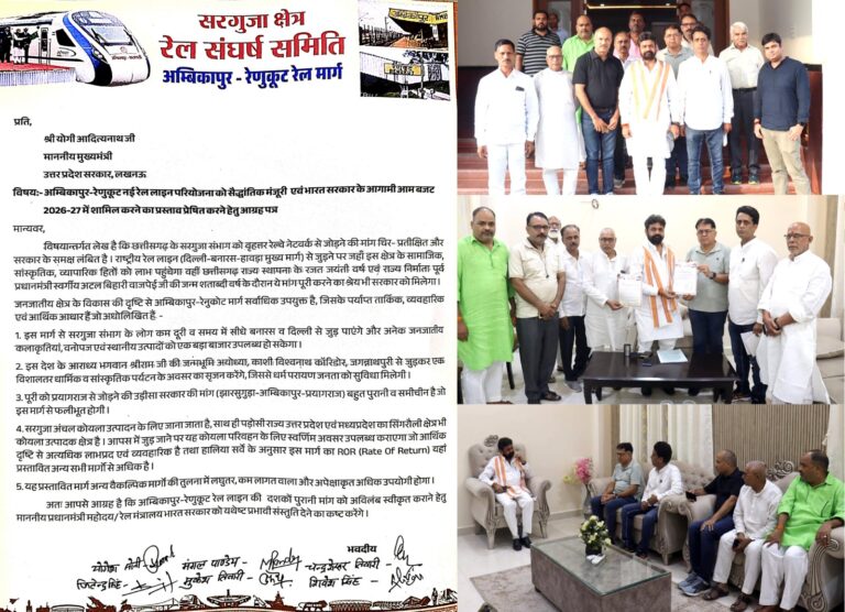 उत्तर प्रदेश सरकार के आयुष,खाद्य सुरक्षा एवं औषधि प्रशासन विभाग के मंत्री डॉ दयाशंकर मिश्र ‘दयालु’ एक दिवसीय प्रवास पर अंबिकापुर पहुंचे थे। अंबिकापुर रेणुकूट रेल मार्ग के लिए प्रयासरत,सरगुजा क्षेत्र रेल संघर्ष समिति ने उनसे मुलाकात कर भारत सरकार के आगामी आम बजट 2026- 27 में अंबिकापुर रेणुकूट नई रेल लाइन परियोजना को शामिल करने का प्रस्ताव,उत्तर प्रदेश सरकार द्वारा प्रेषित करने के लिए मुख्यमंत्री को संबोधित आग्रह पत्र सौंपा।