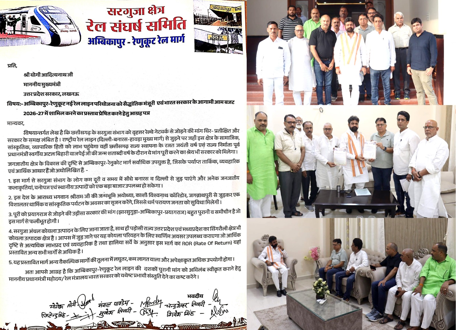 मुलाकात के दौरान राज्य मंत्री स्वतंत्र प्रभार डॉ मिश्र ने इस रेल परियोजना और इसकी स्वीकृति के लिए किया जा रहे प्रयासों के बारे में विस्तार पूर्वक जानकारी प्राप्त की। उन्होंने कहा कि प्रदेश की राजधानी रायपुर से मार्ग के माध्यम से सांस्कृतिक राजधानी वाराणसी के जुड़ने पर न केवल दोनों प्रदेश के लोगों को आवागमन का लाभ मिलेगा, बल्कि सामाजिक,सांस्कृतिक, व्यापारिक, धार्मिक संबंध और मजबूत होंगे। रोजगार और पर्यटन के अवसर का सृजन भी होगा इसलिए प्राथमिकता के आधार पर इस रेल लाइन को मूर्त रूप देने के लिए वे समुचित पहल करेंगे। रेल संघर्ष समिति के सदस्यों ने बताया कि इस रेल लाइन के पिछले सर्वे में इसका रेट ऑफ़ रिटर्न लगभग 14 प्रतिशत और अक्टूबर 2023 में संपन्न फाइनल लोकेशन सर्वे में इकोनॉमिकल इंटरनल रेट ऑफ़ रिटर्न 19.5 प्रतिशत है जो रेलवे के नई रेल परियोजनाओं के लिए निर्धारित मानकों के सर्वथा उपयुक्त है। आगामी वित्तीय वर्ष 2026-27 के आम बजट में स्वीकृति के लिए उत्तर प्रदेश सरकार से भी रेल से संबंधित केंद्र को भेजे जाने वाले प्रस्ताव में अंबिकापुर रेणुकूट रेल लाइन को शामिल कर प्रेषित करने से,निश्चित रूप से इसकी स्वीकृति की दिशा में निर्णायक कदम होगा।
