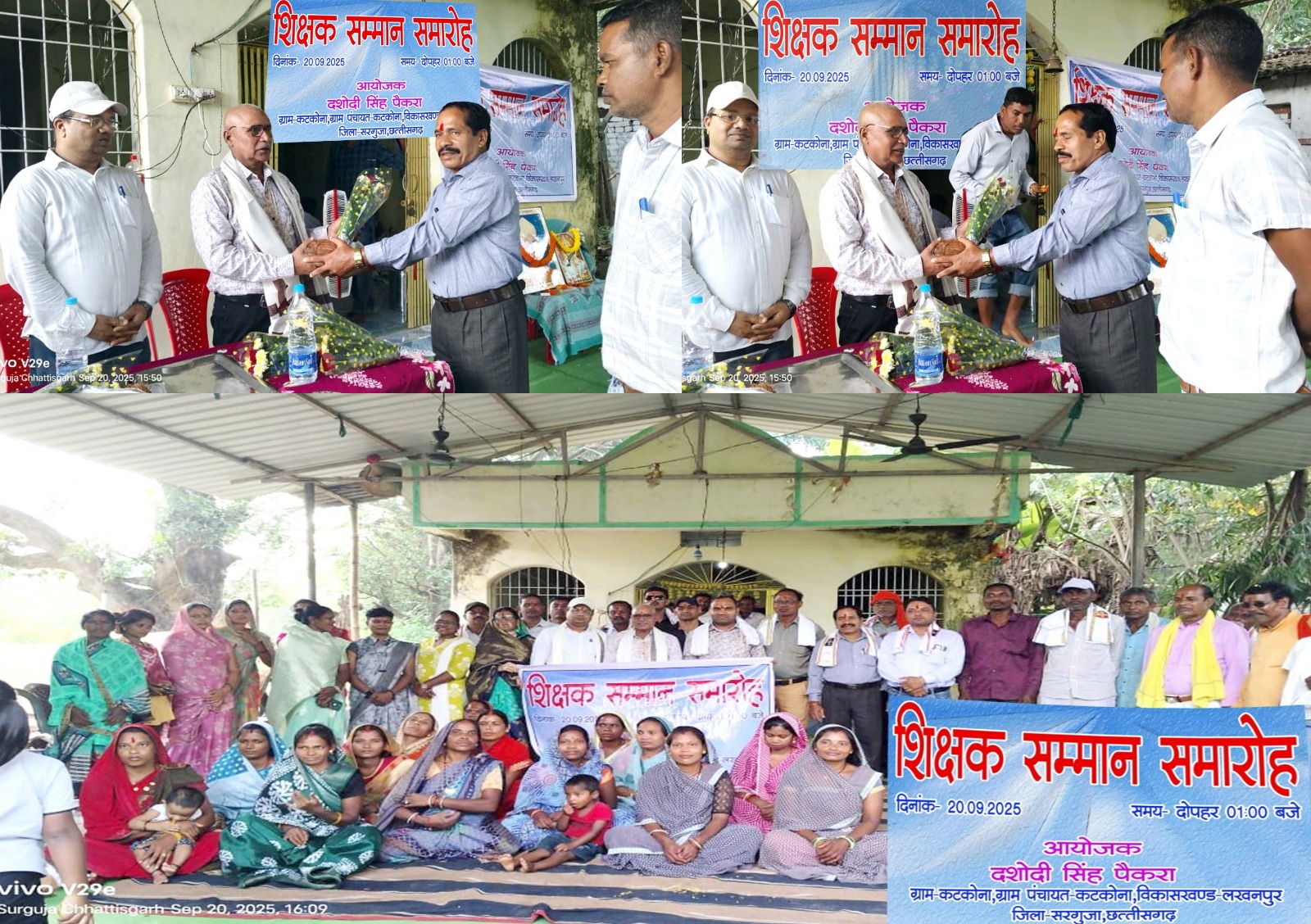 ग्राम पंचायत कटकोना में शिक्षक सम्मान समारोह कार्यक्रम का आयोजन शिव मंदिर के प्रांगण में किया गया। कार्यक्रम के मुख्य अतिथि वरिष्ठ समाज सेवी मंगल पाण्डेय संयोजक नवा बिहान नशामुक्ति जागरूकता अभियान सरगुजा सह निर्देशक चिराग सोशल वेलफेयर सोसायटी अम्बिकापुर एवं विशिष्ट अतिथि मानवाधिकार एंटी करप्शन ब्यूरो के श्री संतोष कुमार विश्वकर्मा जी के द्वारा पूर्व राष्ट्रपति डॉ. सर्वपल्ली राधाकृष्णन के छाया चित्र में माल्यार्पण एवं दीप प्रज्वलित कर सरस्वती वंदना के साथ कार्यक्रम की शुरुआत किया गया। इसके पश्चात् मुख्य अतिथि एवं समस्त शिक्षक/शिक्षिकाओं का पुष्पगुच्छ से स्वागत किया गया। शिक्षक सम्मान समारोह कार्यक्रम की आयोजिका समाजसेविका दशोदी सिंह ने स्वागत उद्बोधन करते हुए अपने विचार को साझा किया। शिक्षक सम्मान समारोह कार्यक्रम के मुख्य अतिथि वरिष्ठ समाजसेवी श्री मंगल पाण्डेय ने अपने उद्धबोधन में कहा कि ज्ञान और कौशल प्रदान करने से लेकर व्यक्तित्व विकास और समाज को सशक्त बनाने में गुरु का बहुत बड़ा योगदान होता है। साथ ही शिक्षा की गुणवत्ता, पंचायती राज अधिनियम , पंचायत उपबंध विस्तार अधिनियम एवं विकास में समुदाय की सहभागिता विषय पर अपना अनुभव साझा किए। पूर्व जनपद सदस्य धर्मेंद्र कुमार झरिया ने अपने उद्धबोधन में कहा कि आदि कर्म योगी अभियान एक सरकारी पहल है ।जिसका उद्देश्य जनजातीय क्षेत्रों में विकास और कल्याण को बढ़ावा देना है। इसका मुख्य उद्देश्य आदिवासी बहुल क्षेत्रों में स्वास्थ्य, शिक्षा, पोषण, कौशल विकास, आजीविका संवर्धन, स्वच्छता, जल-संरक्षण और पर्यावरण संरक्षण जैसी गतिविधियों को बढ़ावा देना है। इसी कड़ी में प्राथमिक शाला कटकोना के शिक्षक भागीरथी कुमार अजय के द्वारा कहा गया कि बच्चों का पहला शिक्षक उनके माता-पिता होते हैं।बच्चे को बचपन में जैसे ढांचा में ढालेंगे वैसे ही ढ़लेगा। शासकीय माध्यमिक शाला कटकोना के प्रधान पाठक दिनेश कुमार ने कहा कि छात्रों में आत्मविश्वास जगाने और उन्हें अपना सर्वश्रेष्ठ प्रदर्शन करने के लिए गुरु के साथ -साथ माता -पिता का अहम भूमिका होता है। प्रधान पाठक त्रिवेणी झरिया ने कहा की शिक्षक बच्चों को प्रेरित करने, मार्गदर्शन करने और उनका भविष्य बनाने में महत्वपूर्ण भूमिका निभाते हैं। वे उन्हें ज्ञान, संस्कार, और सही दिशा दिखाते हैं ।जिससे वे जीवन में सफल होकर अच्छे इंसान बन पाते हैं। शिक्षक मार्गदर्शक के साथ-साथ अपने शिष्य के सपनों को साकार करने में मदद करते हैं। शिक्षक के साथ बच्चों के परिवार वालों का प्रेरणा किस प्रकार का है ये भी निर्भर करता है। शिक्षा की गुणवत्ता में कमी आने का एक कारण डिजिटल कार्य एवं शिक्षक को अन्य गैर 