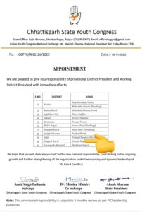 युवा कांग्रेस ने जारी किया नियुक्ति आदेश,